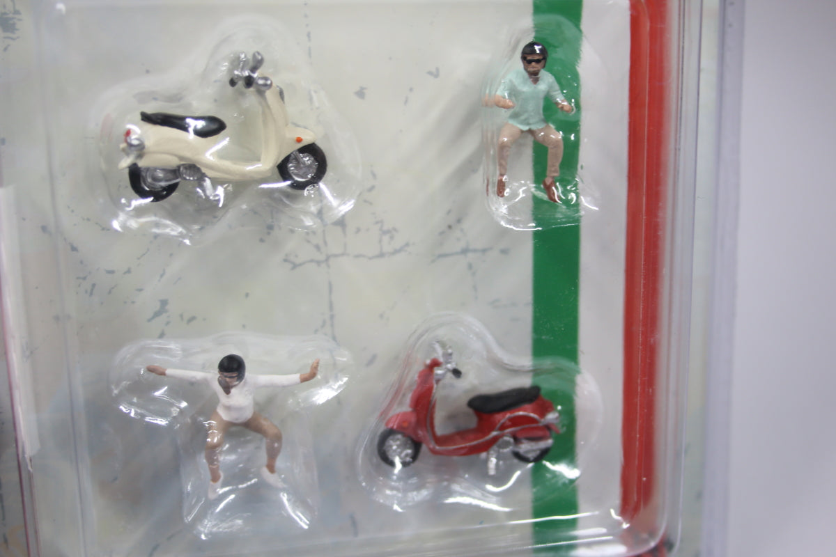Featuring two figures and two mopeds (Vespas).