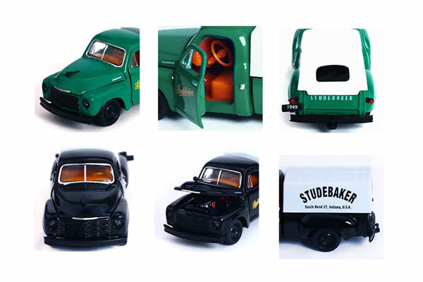 1949 Studebaker 2R Truck #1 - This cool Studebaker truck is painted Green and has a Dark Tan interior. The canvas bed cover has a cool new Studebaker graphic. The stock inline 6 cylinder powers the 2R. Black rims and tyres round out the rolling stock. For a different look all the normally chrome item are now black.