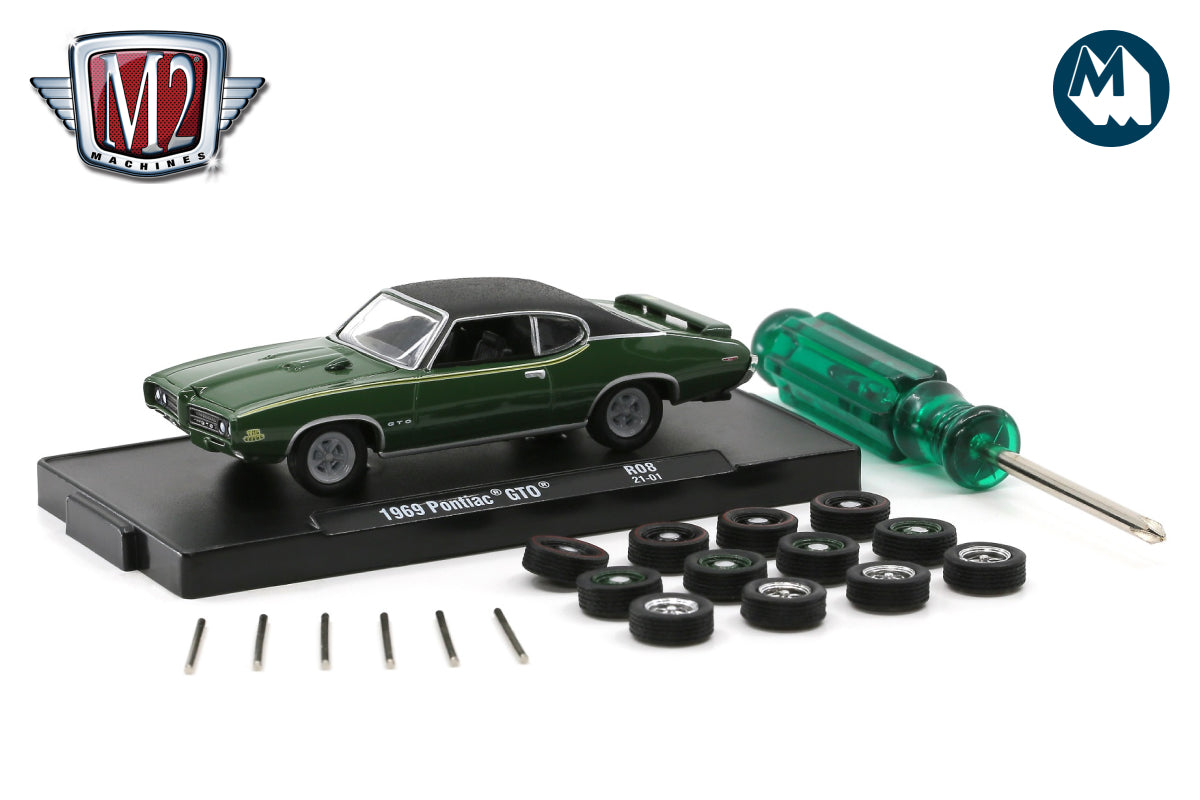 1:64 scale kit that includes a 1969 Pontiac GTO, six pairs of wheels, rubber tyres, axles and a screw driver - great for those who customise their own cars, or a joint project with the kids.