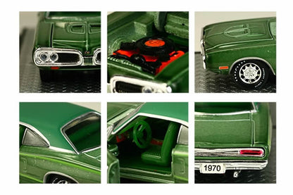 This is a very Quadruple Tone Green car! The body is Light Green metallic, with a Green Vinyl top, Ledger Green Stripes, and Green bucket seat & console interior. Wheels are Dodge Rallye Wheels with Goodyear Polyglas text.