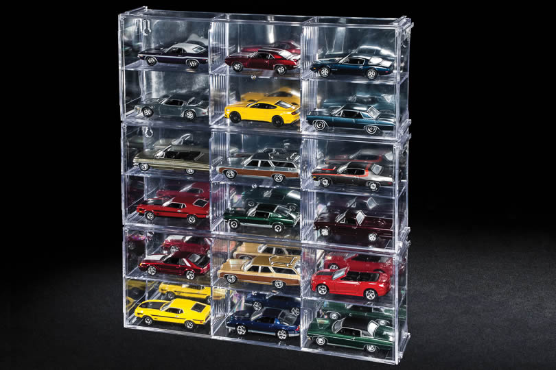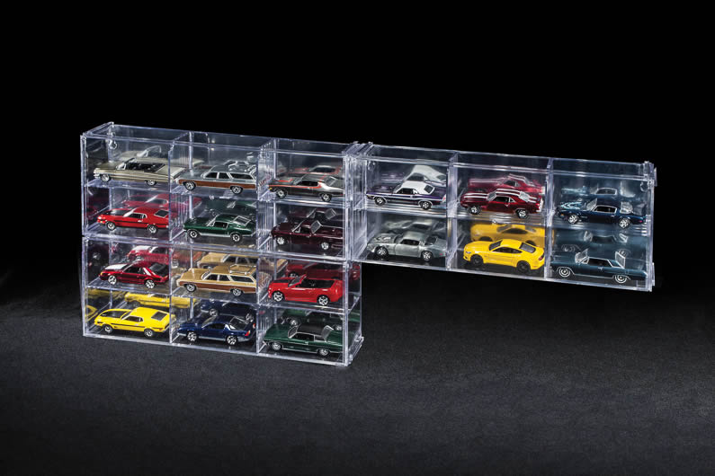 Stick your 1:64 collection on the wall with these modular display cases. Multiple sets will interlock above, below and besides each other.