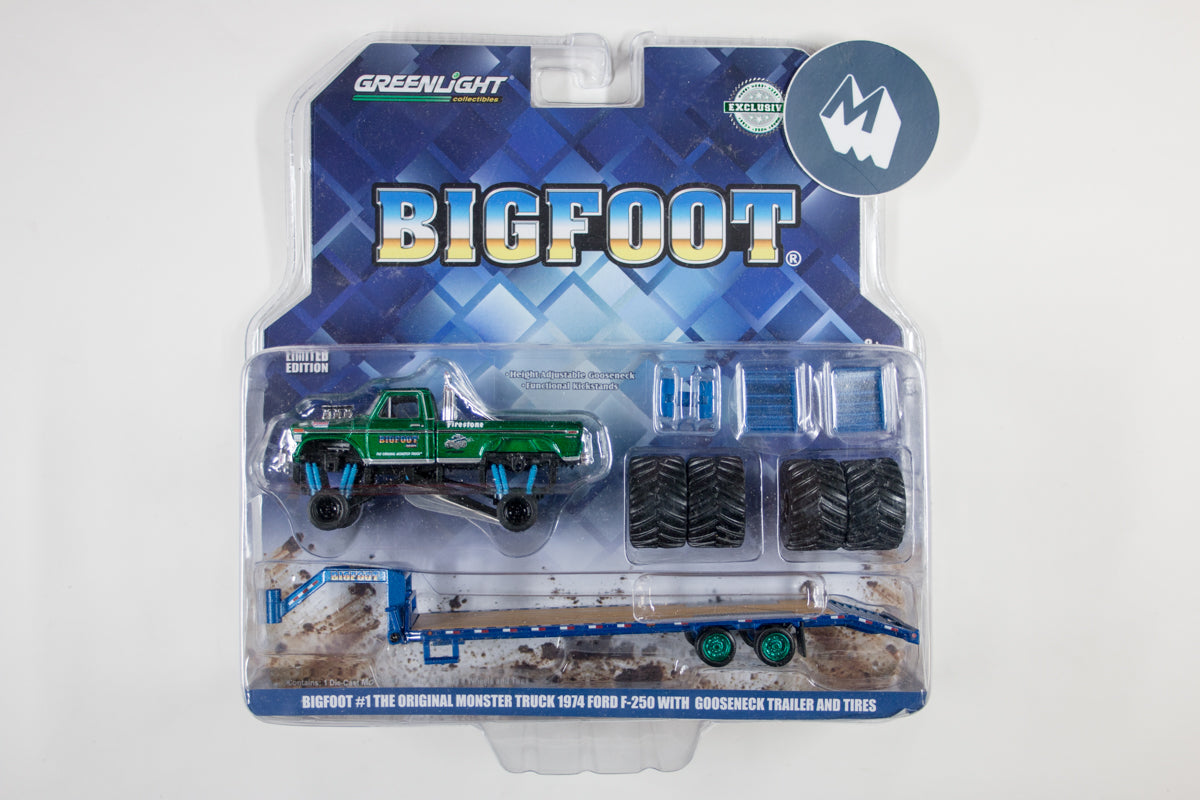 ![[Green Machine] Bigfoot #1 The Original Monster Truck (1979) - 1974 Ford F-250 Monster Truck on Gooseneck Trailer with Regular and Replacement 66" Tyres](http://modelmatic.uk/cdn/shop/products/IMG_4589.jpg?v=1573576272&width=1445)