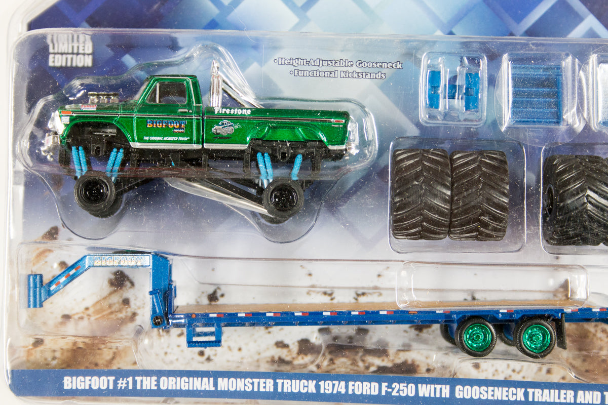 [Green Machine] Bigfoot #1 The Original Monster Truck (1979) - 1974 Ford F-250 Monster Truck on Gooseneck Trailer with Regular and Replacement 66" Tyres