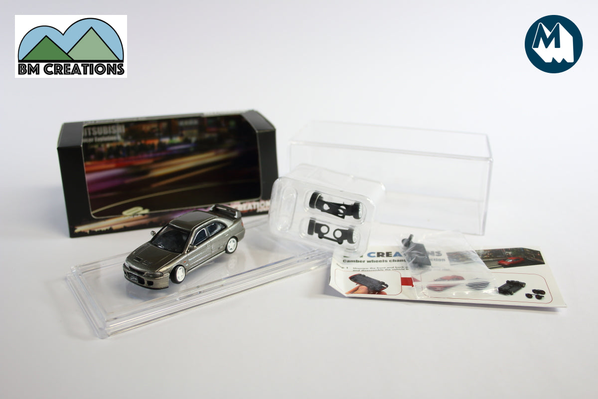 Right hand drive Mitsubishi Lancer Evolution II in silver with a spare set of wheels, suspension adjusting kit and acrylic case.